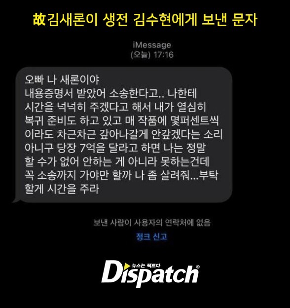 Đặc biệt, phía tài tử này còn có động thái gửi giấy nợ trong lúc Kim Sae Ron không có khả năng trả nợ. Trong giấy nợ viết: "Nếu toàn bộ số tiền vay không được trả trong thời gian ngắn, chúng tôi sẽ thực hiện hành động pháp lý dân sự và hình sự". Vì không có khả năng trả nợ ngay lập tức nên Kim Sae Ron đã nhắn tin cầu cứu Kim Soo Hyun. Tài tử này được cho là đã chuyển tiếp tin nhắn cầu cứu của Kim Sae Ron cho hàng loạt phóng viên, làm lộ số điện thoại của cô.