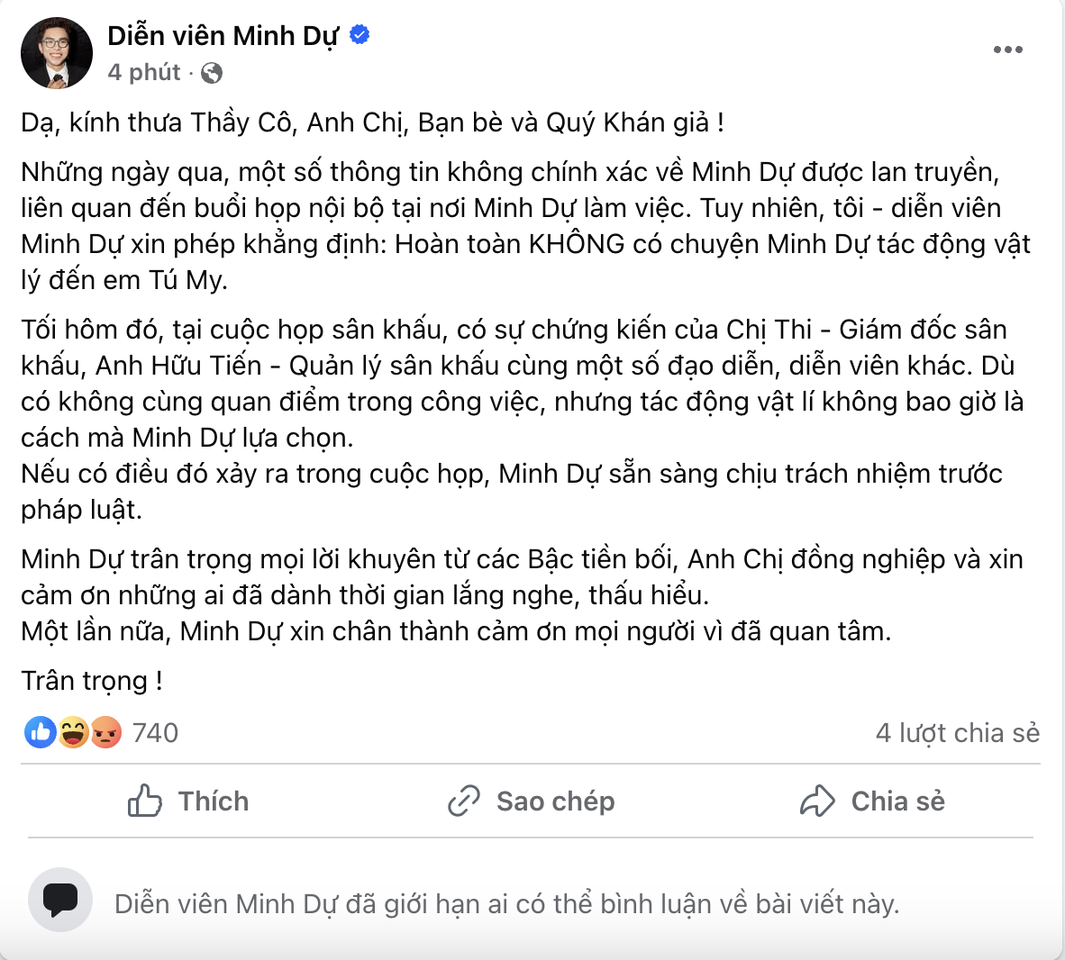 Tối 6/2, diễn viên Minh Dự đã chính thức lên tiếng trên trang cá nhân về ồn ào "tác động vật lý" diễn viên Tú My - con gái NS Lê Quốc Nam. Trong bài đăng, nam diễn viên khẳng định hoàn toàn không có chuyện anh tác động vật lý hay có hành vi làm tổn thương bất kỳ ai. Minh Dự cho biết sự việc bắt nguồn từ mâu thuẫn công việc, dẫn đến tranh luận căng thẳng giữa nam diễn viên và Tú My trong buổi họp nội bộ tại sân khấu nơi anh đang làm việc.