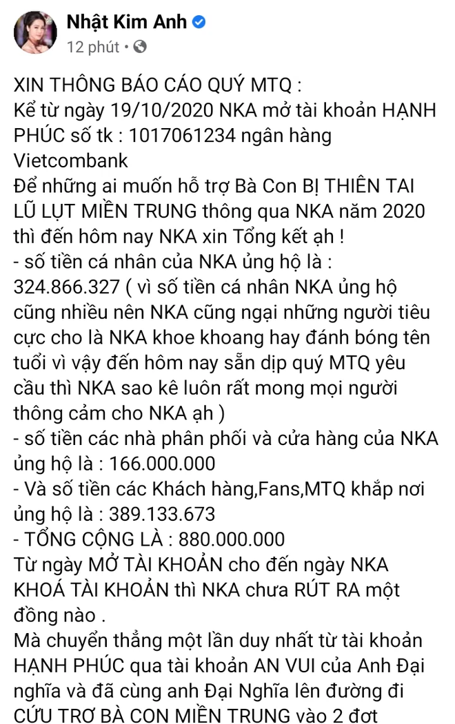 Kể từ ngày 19/10/2020 Nhật Kim Anh mở tài khoản Hanh Phúc số tài khoản : 1017061234 ngân hàng Vietcombank. Để những ai muốn hỗ trợ bà con bị thiên tai lũ lụt miền Trung thông qua Nhật Kim Anh năm 2020 thì đến hôm nay Nhật Kim Anh xin tổng kết ạ!