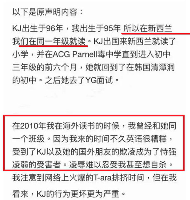 Người này không chỉ đích danh Jennie, thay vào đó sử dụng từ viết tắt là "KJ" (được cho là Kim Jennie). Theo lời kể, KJ sinh năm 1996, còn người kia sinh năm 1995, cả hai học cùng một khoá. Thời điểm năm 2010 khi vừa tới New Zealand, khi tiếng Anh còn chưa thành thạo, người này đã bị KJ cùng những người bạn ngoại quốc bắt nạt, sỉ nhục một cách thậm tệ, khiến cho người này có ý định muốn tự tử.