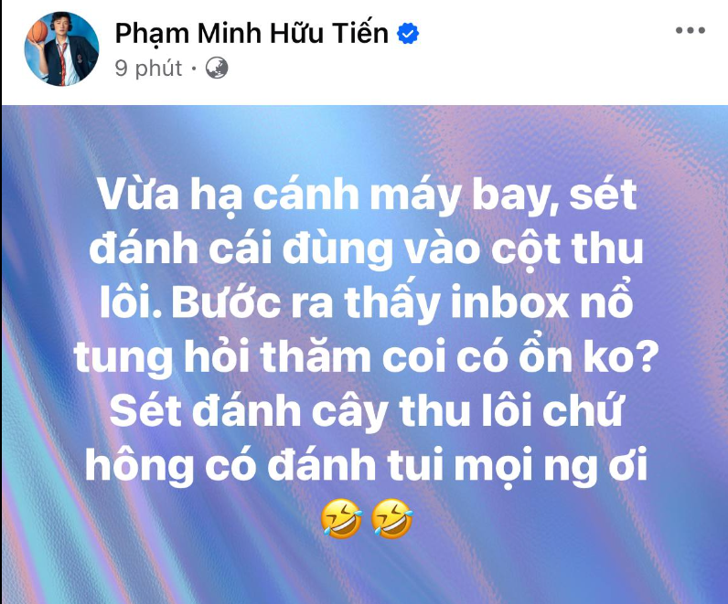 Dược sĩ Tiến nói: "Vừa hạ cánh máy bay, sét đánh cái đùng vào cột thu lôi. Sét đánh cột thu lôi chứ không có đánh tôi mọi người ơi".