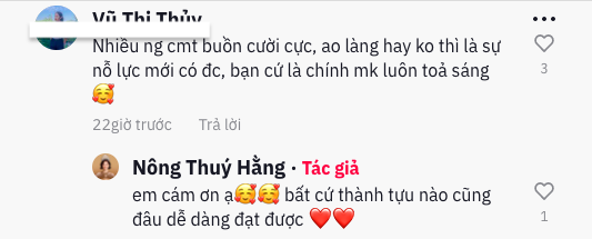 Bên dưới phần bình luận, người đẹp cũng khẳng định dù là bất cứ thành tựu nào cũng đâu dễ dàng đạt được, vì vậy cô luôn trân trọng danh hiệu của bản thân. Nông Thúy Hằng cũng tỏ ra vô cùng bình thản và lạc quan trước những bình luận trái chiều trên mạng xã hội. Cô thậm chí cho hay: "Em nghĩ những bình luận tiêu cực cũng không hẳn là xấu, đôi khi cho mình cơ hội để nói ra những điều mọi người không nghĩ tới".
