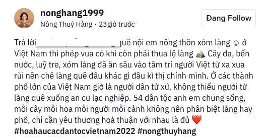 Sau khi đăng quang Hoa hậu các Dân tộc Việt Nam 2022, Nông Thúy Hằng liên tục gây tranh cãi với ồn ào tình cảm, nhan sắc, học thức. Mới đây, trên kênh TikTok cá nhân, người đẹp sinh năm 1999 bất ngờ nhận được bình luận chê bai cô là "Hoa hậu ao làng".