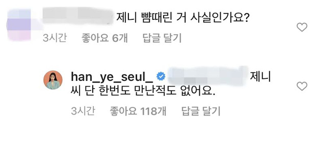 Sau khi bạn trai bị Dispatch "bóc" quá khứ trai bao, Han Ye Seul đã viết 1 tâm thư dài trên trang cá nhân. Vào ngày hôm qua (4/6), nữ diễn viên tiếp tục trực tiếp trả lời bình luận của fan, thông qua đó làm rõ 1 số tin đồn về bản thân. Trong số đó có tin đồn Han Ye Seul từng tát thẳng mặt Jennie (BLACKPINK) trong lúc cô đang hẹn hò Teddy, vì nghi Jennie và bạn trai mình "có điều mờ ám".