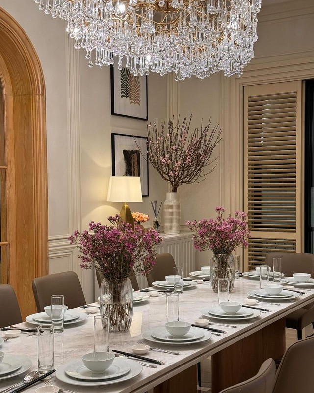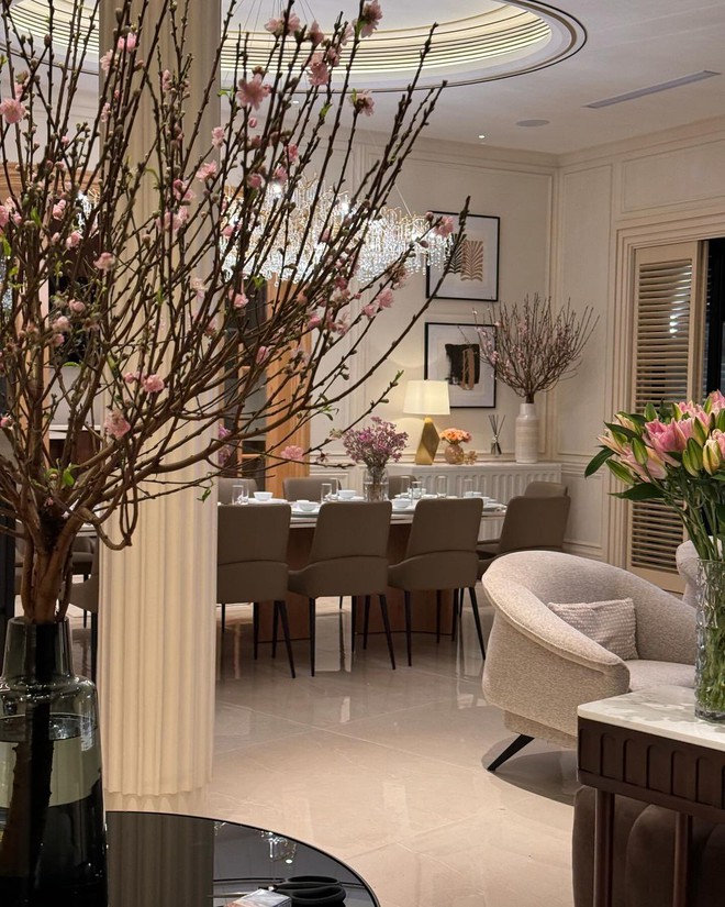Tổ ấm của Noo Phước Thịnh vốn được thiết kế theo phong cách hiện đại với gam màu be và nội thất gỗ ấm áp. Nam ca sĩ cũng sắm thêm những chiếc đèn chùm, đèn để bàn sang trọng để giúp không gian thêm lung linh và sang xịn. Để ngôi nhà tràn ngập không khí Tết, mẹ của Noo Phước Thịnh đã sắm đến 3 loại hoa đều mang gam màu hồng - tím chủ đạo là: hoa đào, hoa ly và hoa cúc tím. Theo đó, 2 cành đào phai được mẫu hậu của Noo Phước Thịnh cắm trong bình gốm và đặt trên kệ tủ và bàn uống nước. Hai bình hoa cúc được bày trên bàn ăn của căn nhà. Bình hoa ly màu tím cũng được chọn lọc và chăm chút vô cùng tỉ mỉ, khéo léo.
