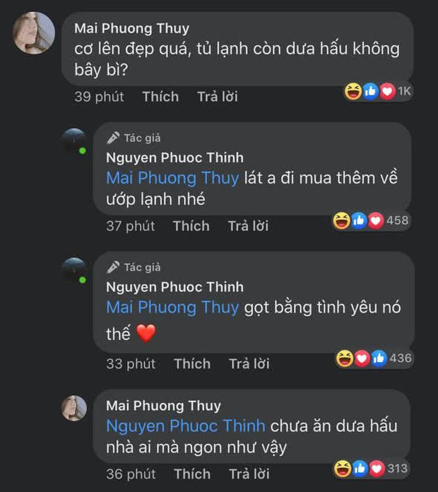 "Trận địa cẩu lương" lần này của cặp đôi là ngay tại Facebook của chàng Noo. Ngay sau khi Noo Phước Thịnh khoe tấm ảnh body vạm vỡ, Mai Phương Thuý liền bình luận kèm theo 1 tiếng "bây bì" thân thương: "Cơ lên đẹp quá, tủ lạnh còn dưa hấu không 'bây bì'?". Liền sau đó, người tung kẻ hứng, cả 2 liên tục tán tỉnh nhau thông qua câu chuyện xoay quanh việc... gọt dưa.