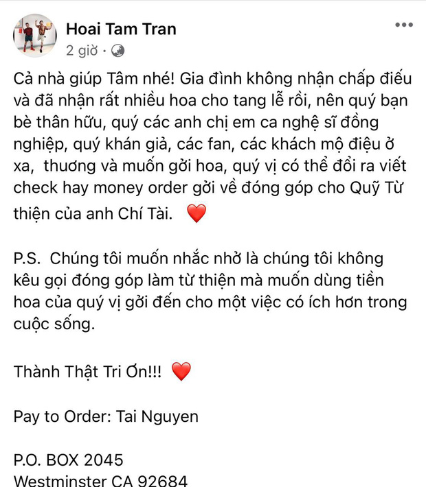 Theo đó, ngoài việc nhắc nhở khách đến viếng đeo khẩu trang và giữ khoảng cách do dịch Covid-19, Hoài Tâm còn lên tiếng làm rõ thông tin nhận tiền thay cho vòng hoa đến viếng. Cụ thể, anh viết: "Cả nhà giúp Tâm nhé. Gia đình không nhận chấp điếu và đã nhận rất nhiều hoa cho tang lễ rồi, nên quý bạn bè thân hữu, quý các anh chị em ca nghệ sĩ đồng nghiệp, quý khán giả, các fan, các khách mộ điệu ở xa, thuơng và muốn gởi hoa hay muốn phúng điếu, quý vị có thể đổi ra tiền gởi về đóng góp cho quỹ từ thiện của anh Chí Tài. Chúng tôi muốn nhắc nhở là chúng tôi không kêu gọi đóng góp làm từ thiện mà muốn dùng tiền hoa của quý vị gởi đến cho một việc có ích hơn trong cuộc sống".