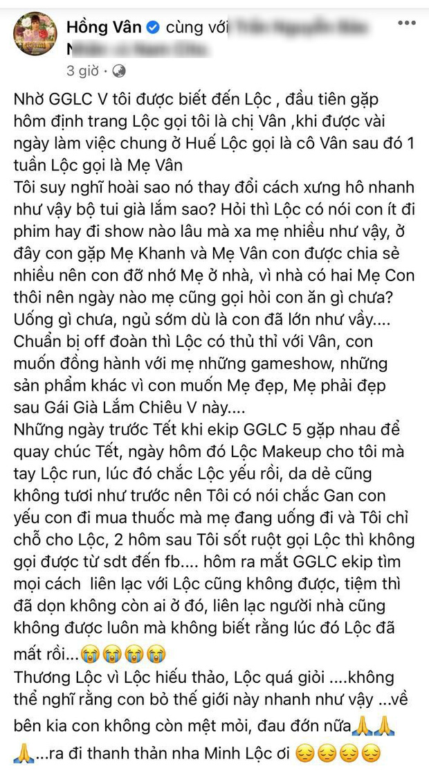 Hỏi thì Lộc có nói con ít đi phim hay đi show nào lâu mà xa mẹ nhiều như vậy, ở đây con gặp mẹ Khanh và mẹ Vân con được chia sẻ nhiều nên con đỡ nhớ mẹ ở nhà. Vì nhà có hai mẹ con thôi nên ngày nào mẹ cũng gọi hỏi con ăn gì chưa? Uống gì chưa, ngủ sớm dù là con đã lớn như vầy. Thương Lộc vì Lộc hiếu thảo, Lộc quá giỏi, không thể nghĩ rằng con bỏ thế giới này nhanh như vậy".