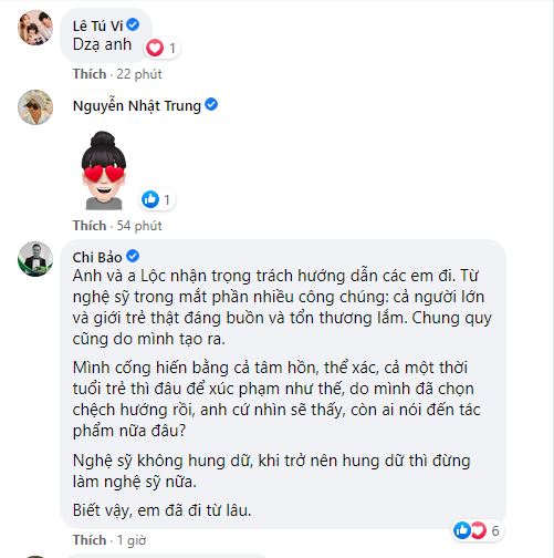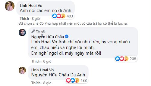 Trước sự việc này, vào khuya ngày 13/12, NSƯT Hữu Châu đã có đôi lời nhắn nhủ đến các đàn em trên trang cá nhân. Anh viết: "Làm gì làm, sao cũng được, nhưng đừng để những người tốt đang thương yêu và trân trọng nghề hát này, nghĩ mình toàn là những người hung dữ". Đáng chú ý, NSƯT Hoài Linh cũng nhanh chóng để lại bình luận thể hiện sự đồng tình với đồng nghiệp: "Anh nói các em nó đi anh".