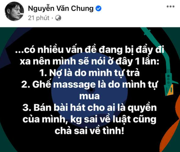 Giữa lúc bị bàn tán xôn xao, tối cùng ngày (20/4), nhạc sĩ Nguyễn Văn Chung đã lên tiếng làm rõ tất cả. Theo đó, nam nhạc sĩ khẳng định tự trả hết nợ và mua ghế massage cho mẹ, ngầm phủ nhận chuyện nhờ Nathan Lee mua bài mới có tiền làm những điều trên.