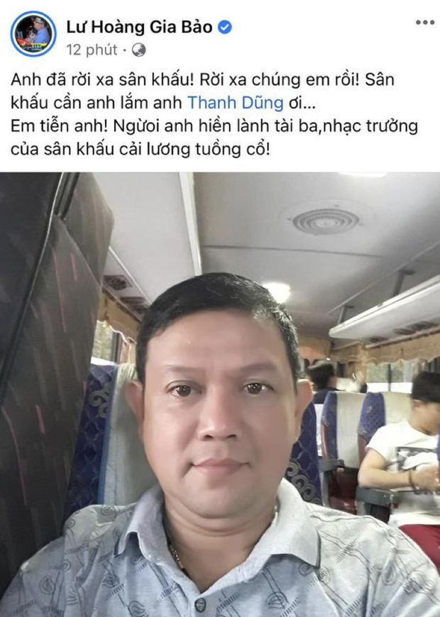 Sự ra đi của nghệ sĩ Thanh Dũng đã để lại niềm thương tiếc vô hạn cho nhiều nghệ sĩ. Trên trang cá nhân, diễn viên Lư Hoàng Gia Bảo cũng đã chia sẻ tin buồn này.