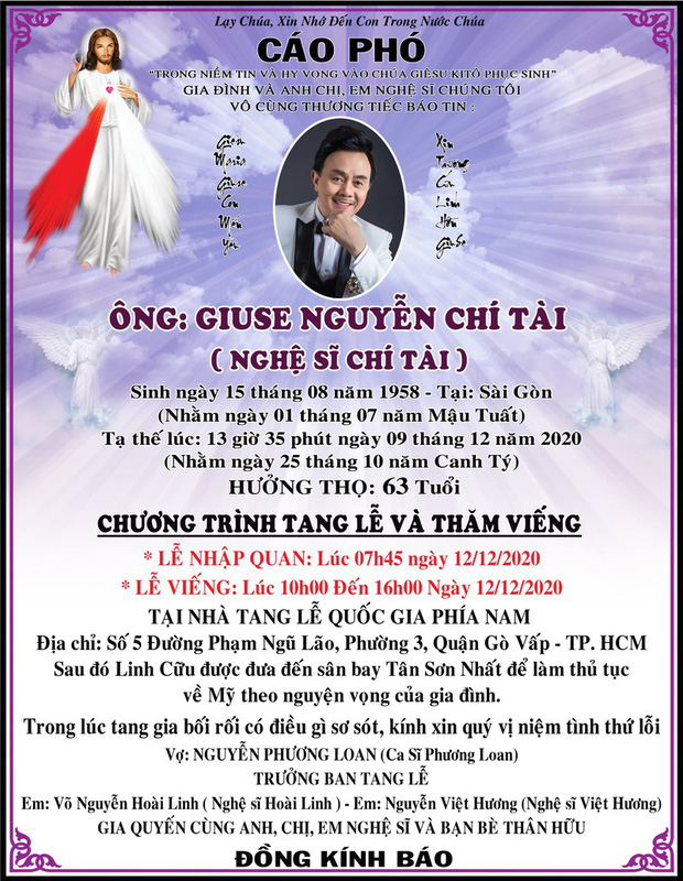 Sáng ngày 12/12, tang lễ cố NS Chí Tài đã được diễn ra tại Việt Nam. NS Hoài Linh và NS Việt Hương được ca sĩ Phương Loan - bà xã của cố NS Chí Tài uỷ quyền lo cho tang lễ của chồng. Rất đông nghệ sĩ và người hâm mộ đã có mặt tại nhà tang lễ để tiễn đưa NS Chí Tài về nơi an nghỉ cuối cùng.