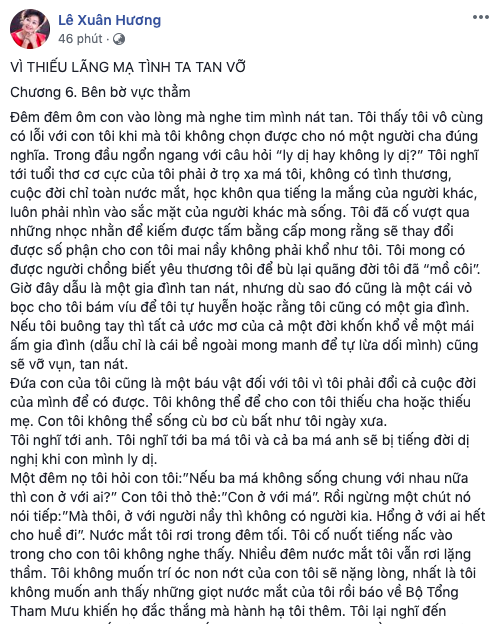 Mặc dù đau khổ nhưng NS Xuân Hương lại tự dằn vặt bản thân rằng không thể nào để cho con thành trẻ không cha. "Tôi không thể để cho con tôi thiếu cha hoặc thiếu mẹ. Con tôi không thể sống cù bơ cù bất như tôi ngày xưa", bà chia sẻ.