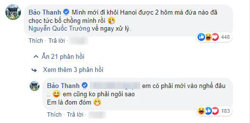 Trong khi Bảo Hân gọi trực tiếp cho NSND Hoàng Dũng để hỏi thì Bảo Thanh lại khéo léo bình luận dưới status của "bố chồng": "Mình mới đi khỏi Hanoi được 2 hôm mà đứa nào đã chọc tức bố chồng mình rồi". Cô còn tag cả anh chồng trăng hoa Quốc Trường và kêu anh về xử lý.