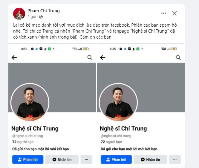 Nam nghệ sĩ viết: "Lại có kẻ mạo danh tôi với mục đích lừa đảo trên Facebook. Phiền các bạn spam hộ nhé. Tôi chỉ có trang cá nhân "Phạm Chí Trung" và fanpage "Nghệ sĩ Chí Trung" đã có tích xanh. Cảm ơn các bạn!".