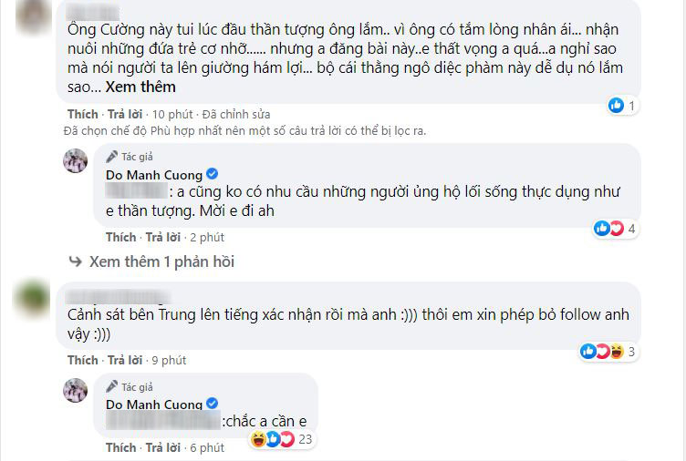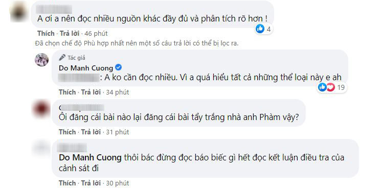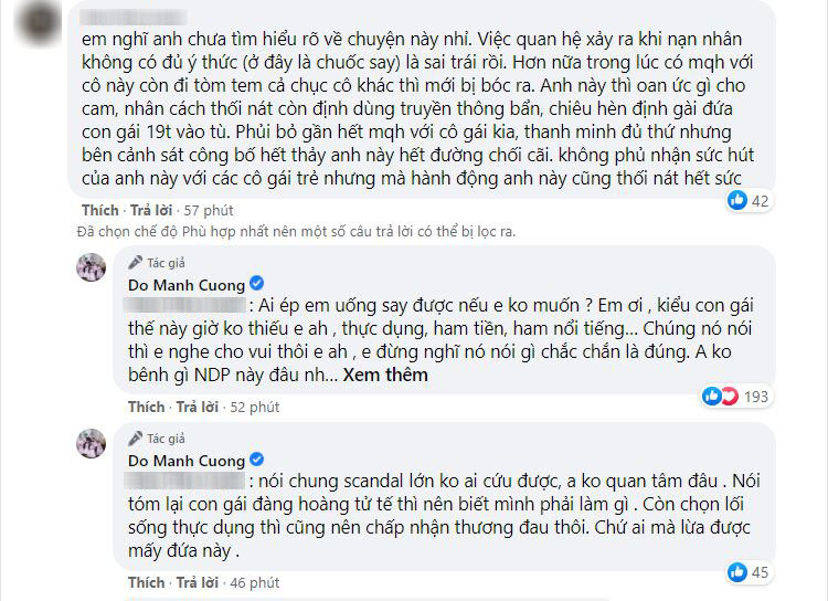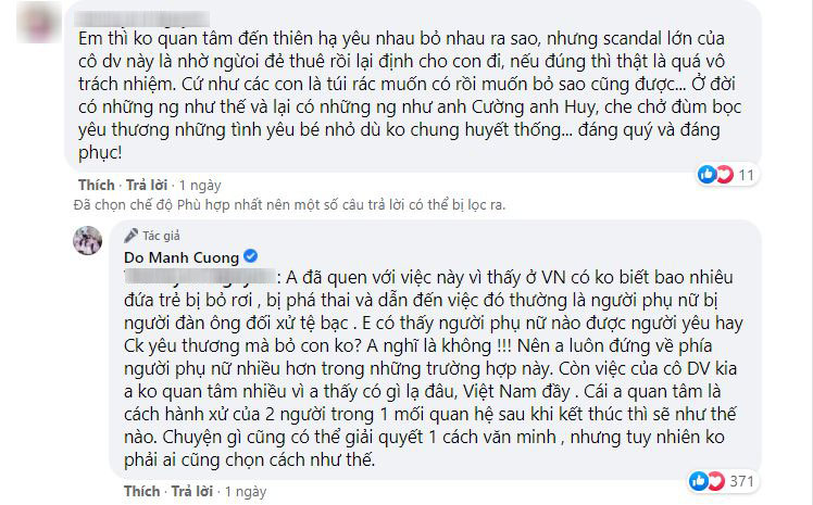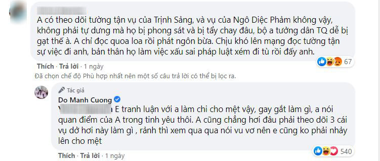 Trước những lời phản bác của dân mạng, Đỗ Mạnh Cường đáp trả: "Em tranh luận với anh làm chi cho mệt vậy, gay gắt làm gì, anh nói quan điểm của anh trong tình yêu thôi. Anh cũng chẳng hơi đâu phải theo dõi 3 cái vụ dở hơi này làm gì, rảnh thì xem qua qua nói vu vơ nên em cũng không phải nhảy lên cho mệt".