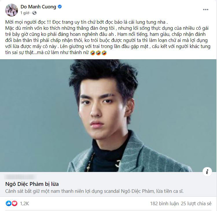 Tuy nhiên, bài đăng của Đỗ Mạnh Cường lại vấp phải ý kiến trái chiều. Một số cư dân mạng cho rằng Đỗ Mạnh Cường không theo dõi sự việc tường tận đã vội lên tiếng. Trường hợp của Ngô Diệc Phàm và Trịnh Sảng không đơn thuần là chuyện yêu đương rồi chia tay mà vi phạm pháp luật, trái với chuẩn mực đạo đức.