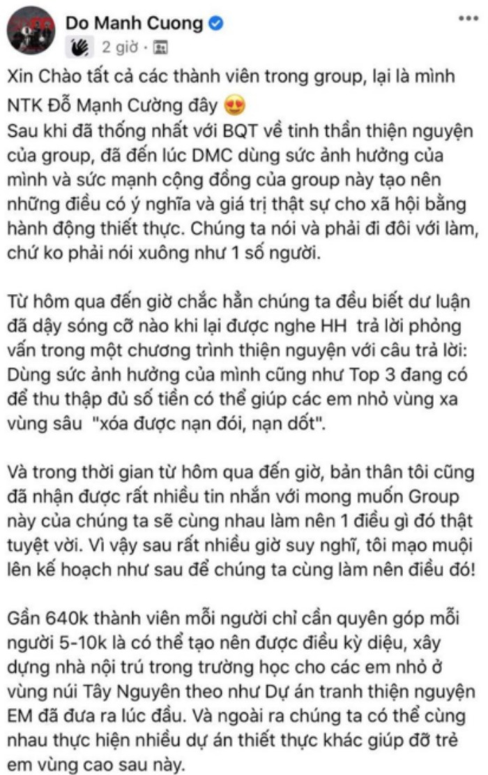 Những cuộc tranh luận liên tục được diễn ra, làn sóng dâng cao khi NTK Đỗ Mạnh Cường công khai ủng hộ và trở thành thành viên của group antifan Hoa hậu Ý Nhi với 650.000 người. Thế nhưng, vào sáng ngày 14/8 hội nhóm này đã tạm dừng khiến nhiều người hoang mang, nhất là ở thời điểm bài viết kêu gọi từ thiện của NTK Đỗ Mạnh Cường vừa được đăng tải cách đó không lâu.