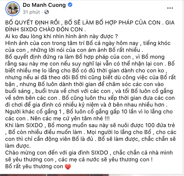 Sau một đêm mất ngủ, Đỗ Mạnh Cường hiểu bản thân thực sự muốn làm bố của cô bé. Dù vậy, anh vẫn mong một ngày nào đó mẹ ruột của bé suy nghĩ lại và đến nhận con. Anh biết nhiều người sẽ lo lắng về việc mình đã có quá nhiều con nuôi thì khó có thể dành thêm thời gian cho một đứa con nữa. Tuy nhiên, anh khẳng định: "Nếu ai đã dõi theo tôi thì đều biết bận rộn đến đâu tôi vẫn luôn tự tay chăm sóc các con vào buổi sáng, buổi trưa tranh thủ về chơi với chúng và buổi tối tôi cũng sắp xếp về sớm quây quần bên các con. Tôi thường thu xếp đưa các con đi chơi, du lịch để gia đình có nhiều kỷ niệm và được bên nhau nhiều hơn. Người khác cố gắng 1 thì tôi cố gắng gấp 10 vì các con".