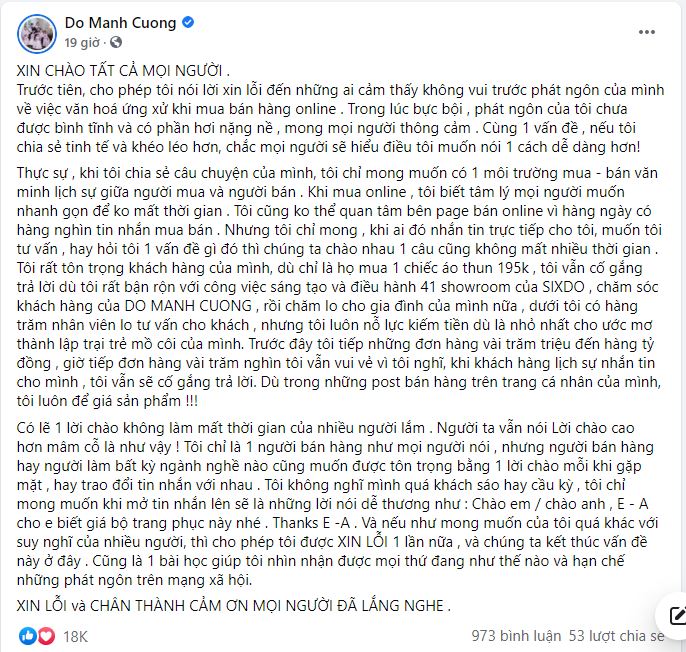 Cho đến tối ngày 2/6, Đỗ Mạnh Cường đã chính thức lên tiếng xin lỗi sau lùm xùm không đáng có: "Trước tiên, cho phép tôi nói lời xin lỗi đến những ai cảm thấy không vui trước phát ngôn của tôi về văn hoá ứng xử khi mua bán hàng online. Trong lúc bực bội, phát ngôn của tôi chưa được bình tĩnh và có phần hơi nặng nề, mong mọi người thông cảm. Cùng 1 vấn đề, nếu tôi chia sẻ tinh tế và khéo léo hơn, chắc mọi người sẽ hiểu điều tôi muốn nói 1 cách dễ dàng hơn!".