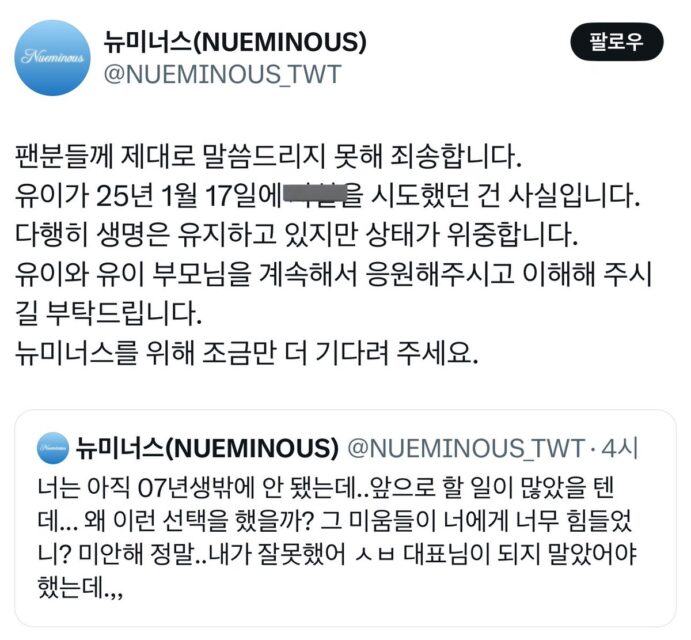 Trên mạng xã hội, CEO tử công ty quản lý của nhóm NUEMINOUS tự trách bản thân sau biến cố của Youee: “Youee đã tự tử vào hôm 17/1. Cô ấy đã được cứu sống, nhưng hiện tại vẫn đang trong tình trạng nguy kịch. Xin mọi người hay thông cảm, đồng thời ủng hộ Youee và cha mẹ cô ấy ở thời điểm khó khăn này. Xin hãy kiên nhẫn chờ đợi nhóm NUEMINOUS thêm 1 thời gian ngắn nữa. Youee, em là cô gái sinh năm 2007. Em vẫn còn nhiều việc cần làm phía trước mà. Sao em lại đưa ra sự lựa chọn cực đoan như vậy? Sự ghét bỏ đã vượt quá sức chịu đựng của em phải không? Đó là lỗi của tôi. Tôi không nên ngồi ở vị trí CEO này”.