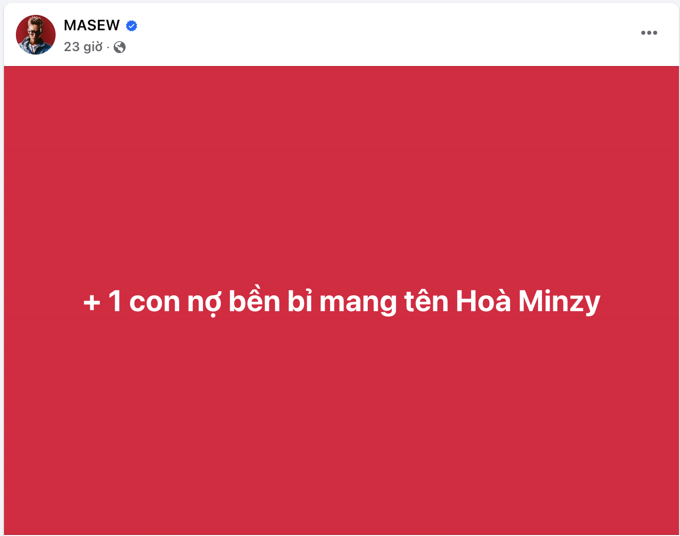 Không dừng lại ở đó, mới đây Masew - producer của MV Bắc Bling cũng tham gia vào hội “đòi nợ” Hòa Minzy. Theo đó trên trang cá nhân, nam producer đăng dòng trạng thái tuyên bố: “+1 con nợ bền bỉ mang tên Hòa Minzy”.