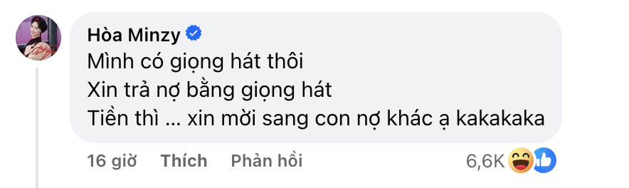 Ngay lập tức, giọng ca sinh năm 1995 cũng phản hồi dí dỏm: “Mình có giọng hát thôi. Xin trả nợ bằng giọng hát. Tiền thì… xin mời sang con nợ khác”. Câu trả lời của Hòa MInzy khiến cộng đồng mạng thích thú khi chủ nhân ca khúc Bắc Bling “bùng kèo” công khai producer Masew.