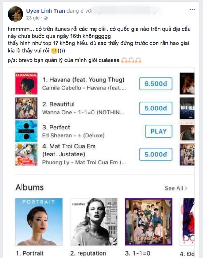 Năm 2017, Uyên Linh ra mắt album Portrait và tự hào khoe trên trang cá nhân rằng album của mình xếp vị trí thứ nhất trên iTunes Việt Nam, vượt qua Reputation của Taylor Swift đình đám thế giới vào thời điểm đó.