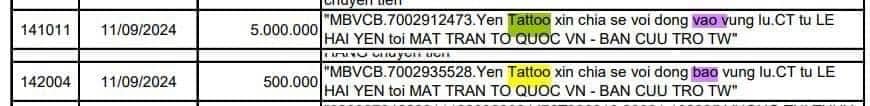 Mới đây, cư dân mạng xôn xao bàn tán tới cái tên nữ ca sĩ Yến Tatoo. Vào ngày 11/9 vừa qua nữ ca sĩ sinh năm 1996 từng chia sẻ hình ảnh chụp màn hình giao dịch thành công số tiền hàng trăm triệu đồng kèm nội dung "Yến Tatoo xin chia sẻ với đồng bào vùng lũ" gửi tới số tài khoản của Ủy ban Trung ương Mặt trận Tổ quốc Việt Nam để ủng hộ bà con vùng lũ trên trang cá nhân. Cô còn viết kèm theo dòng chú thích: "Mong bình an sớm trở lại với đồng bào miền Bắc". Hành động này của Yến Tatoo ở thời điểm đó đã nhận được lời khen ngợi và sự ủng hộ của netizen.