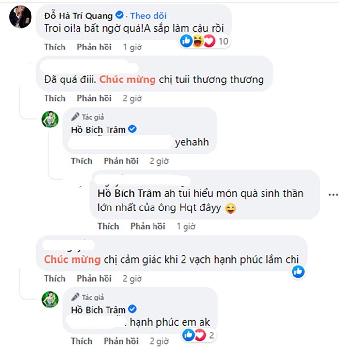 - "Khỏi cưới luôn Trâm ơi mừng quá rồi. Chúc mừng 2 vợ chồng Trâm có em bé nhé".