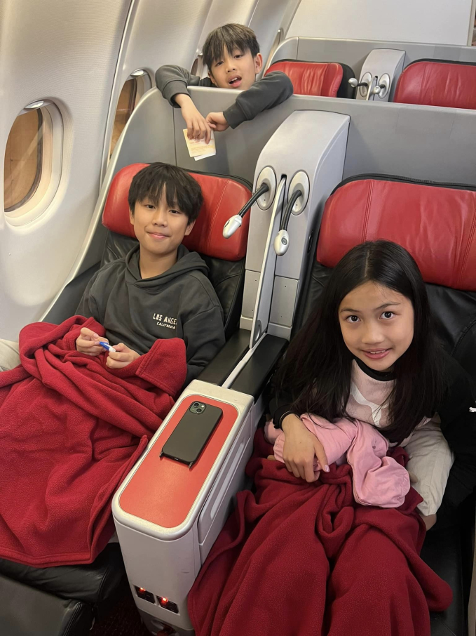 Để có không gian sinh hoạt thoải mái cho các con, Ốc Thanh Vân đã đặt toàn bộ vé là hạng thương gia. Khi về đến sân bay Tân Sơn Nhất, chồng của Ốc Thanh Vân - Trí Rùa đã ra đón 4 mẹ con nữ diễn viên.