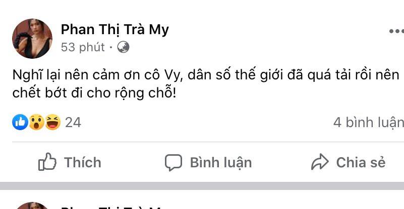 Mới đây, trên trang cá nhân, nữ diễn viên 9X vừa gây chú ý khi đăng tải trạng thái về dịch bệnh Covid-19 với những lời lẽ hết sức vô tâm. Cô viết: "Nghĩ lại nên cảm ơn cô Vy, dân số thế giới đã quá tải rồi nên chết bớt đi cho rộng chỗ!".