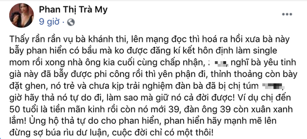 Lùm xùm đang dần lắng xuống thì mới đây, diễn viên Trà My trong bộ phim "Thương nhớ ở ai" lại bất ngờ đăng đàn nêu quan điểm về chuyện vợ chồng Khánh Thi. Cô này viết: "Thấy rần rần vụ bà Khánh Thi, lên mạng đọc thì hoá ra hồi xưa bà này bẫy Phan Hiển có bầu mà không được đăng kí kết hôn định làm 'single mom' rồi xong nhà ông kia cuối cùng chấp nhận. Nghĩ bà yêu tinh già này đã bẫy được phi công rồi thì yên phận đi, thỉnh thoảng còn bày đặt ghen, nó trẻ và chưa kịp trải nghiệm đàn bà đã bị chị túm, giờ hãy thả nó tự do đi, làm sao mà giữ nó cả đời được! Ví dụ chị đến 50 tuổi là tiền mãn kinh rồi còn nó mới 39, đàn ông 39 còn xuân xanh lắm! Ủng hộ thả tự do cho Phan Hiển, Phan Hiển hãy mạnh mẽ lên đừng sợ búa rìu dư luận, cuộc đời chỉ có một thôi!".