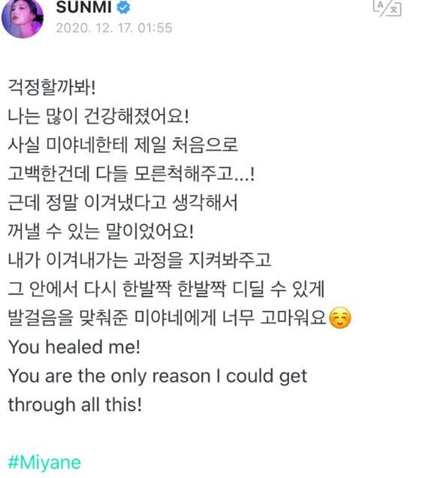 "Chị ra mắt sớm và có thể nói là bắt đầu tham gia vào thế giới người trưởng thành khi còn quá trẻ. Đáng lẽ thời niên thiếu là khoảng thời gian quan trọng để hình thành nên cái "tôi" cho mỗi người, nhưng chị lại dành phần lớn thời gian ngồi trên ô tô. Chị nghĩ việc nhìn lại bản thân, tìm hiểu xem mình thích gì và giỏi gì để tìm cách sống đúng với cảm xúc chính là điều quan trọng nhất. Giờ thì chị đã hiểu được điều đó và chị cũng đỡ hơn rồi. Lượng thuốc chị được kê đã giảm đi rất nhiều nên mọi người không cần phải lo lắng đâu. Chị ổn, chị đã trở nên mạnh mẽ hơn xưa", lời bộc bạch của Sunmi đã khiến không ít người rơi nước mắt.