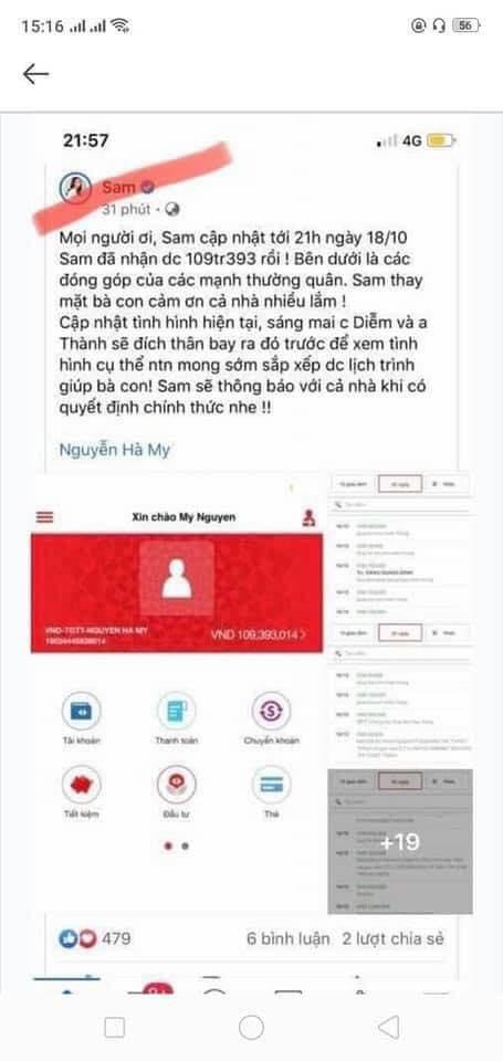 Cư dân mạng cũng đăng tải bài viết của Sam vào năm ngoái sau khi đã kêu gọi từ thiện. Trong bài viết này, Sam cho biết: "Mọi người ơi, Sam cập nhật tới 21 giờ ngày 18/10 Sam đã nhận được 109 triệu 393 rồi! Bên dưới là các đóng góp của các mạnh thường quân. Sam thay mặt bà con cảm ơn cả nhà nhiều lắm!