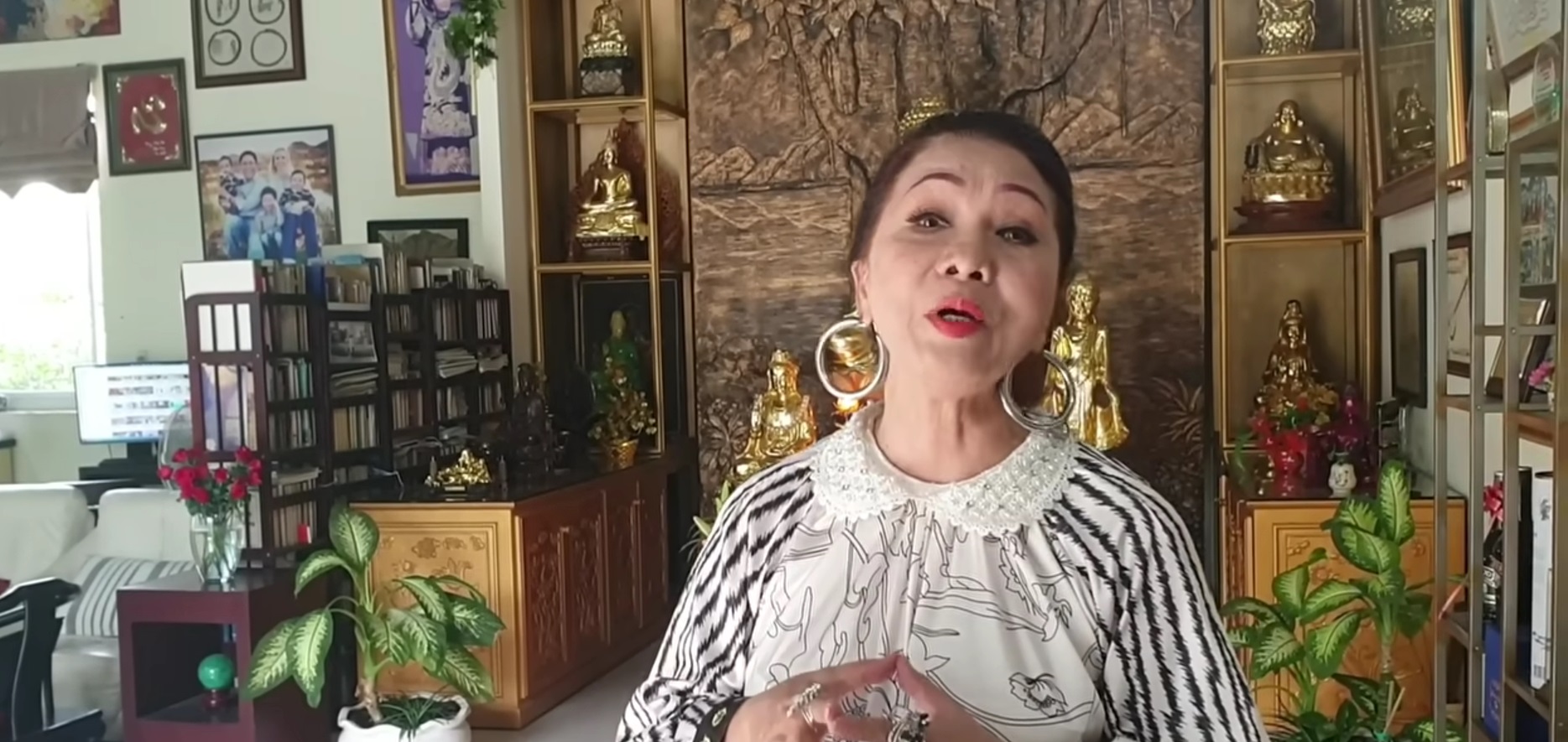 Vừa bước vào cửa nhà, Bạch Tuyết đã để một gian lớn để thờ Phật lớn, công phu, với nhiều tượng, tranh, như một chánh điện tại gia. Nữ nghệ sĩ chia sẻ, bà được các kiến trúc sư bên nhà chùa thiết kế cho gian thờ Phật này, nơi bà thường tụng kinh gõ mõ. Phòng khách của nữ nghệ sĩ rất rộng lớn, bằng cả một căn nhà bình thường.
