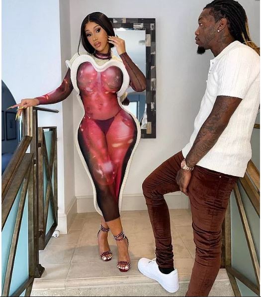 Trong hậu trường, Cardi B mặc trang phục nhìn qua trông giống bộ áo liền quần chất liệu trong suốt có dán những cánh diều màu hồng cùng đá quý lủng lẳng. Tuy nhiên, nó lại không phải như mắt thường nhìn thấy. Cardi B giải thích cô đang mang một số miếng dán cơ thể được dính vào ngực, bụng, chân và tay.