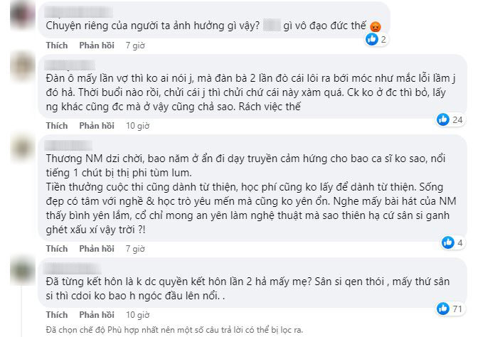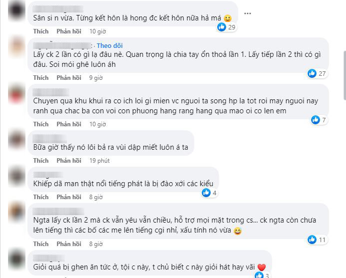 - "Đàn ông mấy lần vợ thì không ai nói gì, mà đàn bà 2 lần đò cái lôi ra bới móc như mắc lỗi lầm gì đó hả. Thời buổi nào rồi, chửi cái gì thì chửi chứ cái này xàm quá. Chồng không ở được thì bỏ, lấy người khác cũng được mà ở vậy cũng chả sao. Rách việc thế"