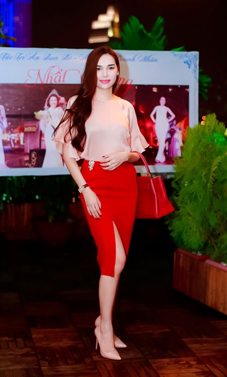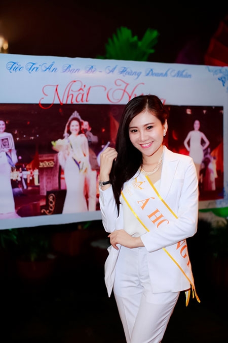 Oanh Yến rạng rỡ tới dự buổi tiệc mừng của diễn viên Nhất Hương tại một nhà hàng sang trọng tại TP HCM. Top 15 Hoa hậu Thế giới người Việt 2010 là người dạy catwalk và tư vấn về trang phục cho Nhất Hương khi cô tham gia cuộc thi 'Nữ hoàng doanh nhân 2015'.