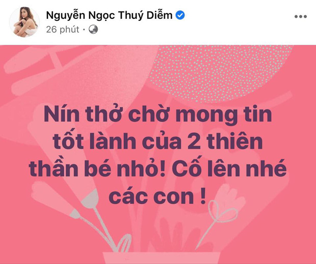 Trên trang cá nhân, Thuý Diễm viết: "Cầu chúc mọi điều may mắn và tốt đẹp nhất đến với 2 thiên thần bé nhỏ. Chúc cho các vị bác sĩ thật tinh anh, thật sáng suốt, vững tay và nhiều may mắn đem lại cuộc đời đẹp nhất cho các con. Nín thờ chờ tin tốt từ các thiên thần nhỏ, cố lên nhé các con". Sau chia sẻ của nữ diễn viên, bạn thân Kha Ly cũng bày tỏ: "Thương quá!". Được biết, ca phẫu thuật tách rời 2 bé với 100 y bác sĩ cùng thực hiện đang diễn ra và dự kiến kéo dài suốt 12 giờ đồng hồ.