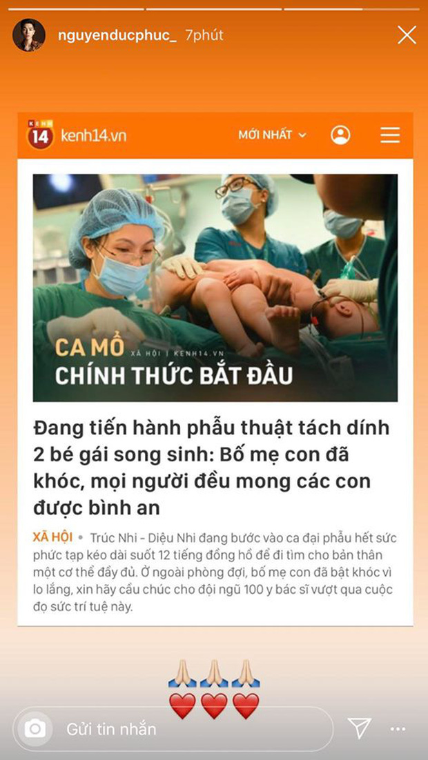 Sáng nay (15/7), cuộc đại phẫu thuật tách 2 bé song sinh dính liền Diệu Nhi - Trúc Nhi đã chính thức diễn ra. Sau 1 năm dùng chung bỉm và sinh hoạt cùng nhau, nhiều người hy vọng 2 bé sẽ được "tái sinh" để sống với cơ thể cá nhân hoàn thiện, lành lặn. Không nằm ngoài sự quan tâm của xã hội, dàn sao Vbiz như Thuý Diễm, Kha Ly, Puka, Ốc Thanh Vân,... đã đồng loạt cầu mong những điều may mắn đến với 2 bé và ủng hộ ekip bác sĩ thực hiện ca đại phẫu thuật này.