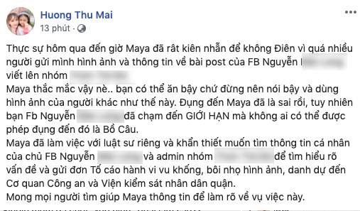 Nữ diễn viên cũng cho biết cô đã làm việc với luật sư riêng và đang tìm thông tin của chủ tài khoản N.B.L để gửi đơn tố cáo hành vi vu khống, bôi nhọ hình ảnh.