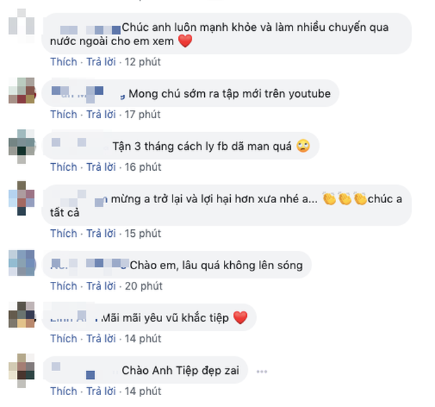 Dưới phần bình luận, đông đảo bạn bè đồng nghiệp và người hâm mộ đều đồng loạt chào mừng sự trở lại của Vũ Khắc Tiệp. Nhiều người yêu thích những vlog du lịch của ông bầu này còn bày tỏ niềm háo hức mong đợi anh sẽ cho ra mắt nhiều nội dung mới trong tương lai.