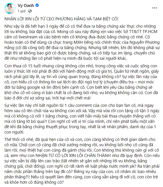 Ngay khi mạng xã hội đang xôn xao về thông tin này thì Vy Oanh bất ngờ đăng tải một bài viết cho rằng bà Phương Hằng không thể đưa ra bằng chứng và mặc định "nhận lời xin lỗi" của nữ đại gia.