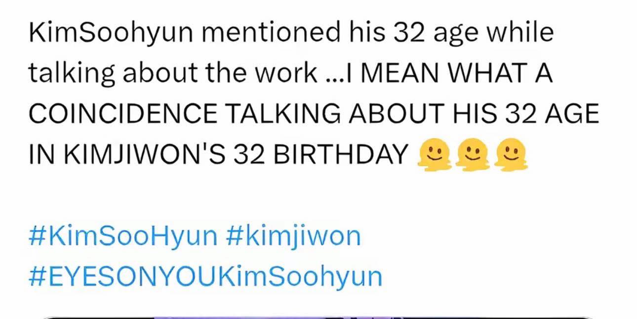 Đến ngày 13/9/2024, Gold Medalist đã công bố lịch trình fan meeting tiếp theo trong khuôn khổ tour EYES ON YOU châu Á của Kim Soo Hyun. Đáng nói, sự kiện đầy ý nghĩa này lại được nam tài tử sắp xếp vào đúng ngày 19/10, trùng sinh nhật 32 tuổi của Kim Ji Won. Đây cũng là fan meeting của nam diễn viên ở Hàn Quốc (cụ thể tại SVĐ Hwajung thuộc Đại học Hàn Quốc). Các "thánh soi" suy đoán rằng, Kim Soo Hyun chọn ngày đặc biệt này để về lại Hàn Quốc dự sinh nhật bạn gái màn ảnh. Đến ngày diễn ra fan meeting, Kim Soo Hyun tiếp tục nhắc đến tuổi 32 - chính là độ tuổi của Kim Ji Won lúc đó.
