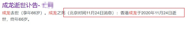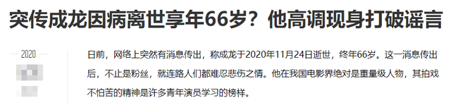 Cách đây vài ngày, trên mạng xã hội xôn xao trước thông tin Thành Long qua đời vào ngày 24/11/2020, hưởng thọ 66 tuổi. Sau khi tin tức được đưa ra, không chỉ người hâm mộ mà tất cả công chúng vô cùng hoang mang, xót xa.