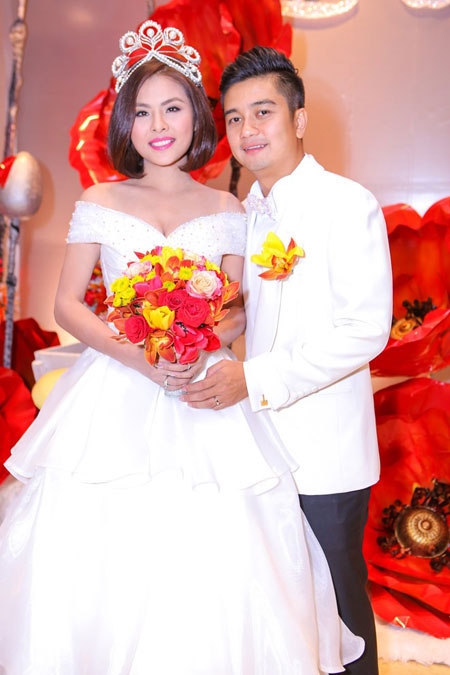 Đám cưới của Vân Trang và chú rể Hữu Quân được tổ chức tại một khách sạn sang trọng ở TP HCM. Nữ diễn viên hóa trang như công chúa bước ra từ truyện cổ tích với vương miện trên đầu. |