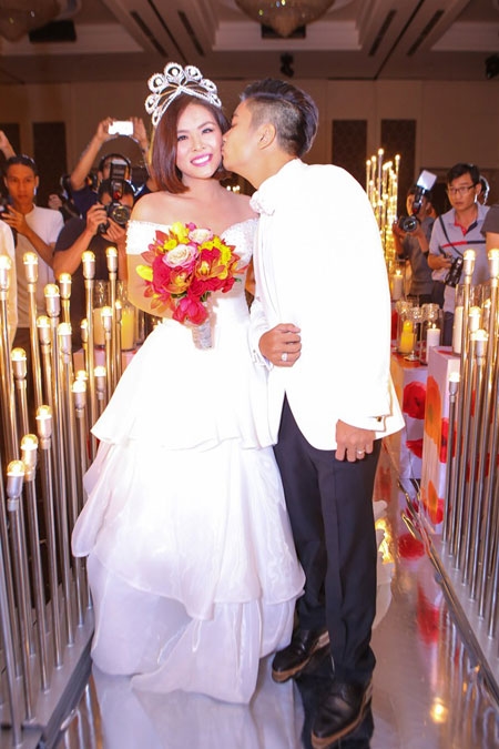 Khi cả hai cùng tiến bước lên sân khấu làm lễ, chú rể khoác tay, hôn vợ tình cảm. |