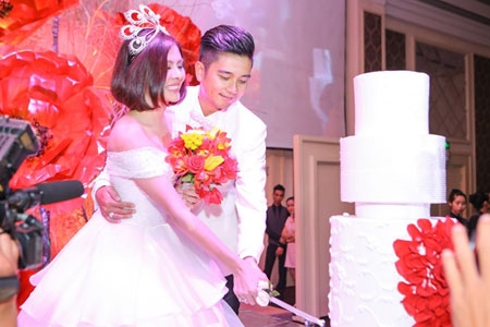 Vợ chồng Vân Trang thực hiện các nghi lễ truyền thống như cắt bánh, mời rượu các đấng sinh thành... trong hôn lễ. |
