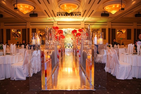 Không gian tiệc cưới được trang hoàng lung linh, sang trọng. |